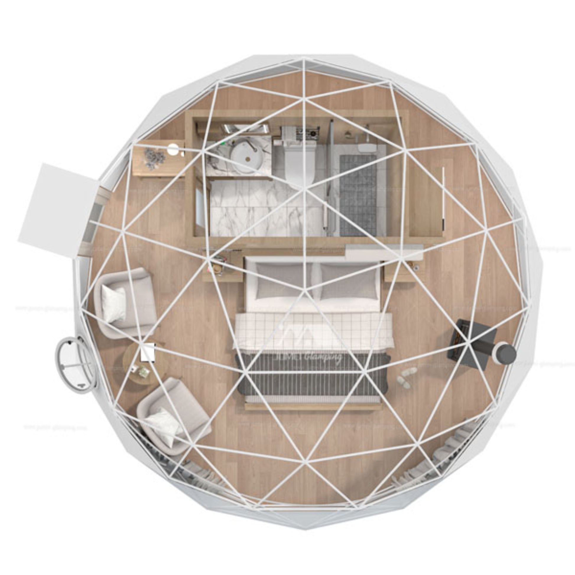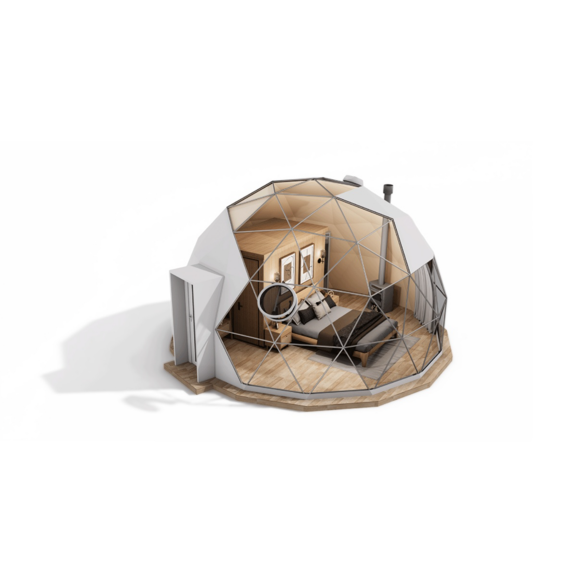 The 6M Dome is a popular mid-size option that balances comfort and flexibility, making it perfect for couples or small families. With over 300 ft² of interior space, it allows for more customization, including bathrooms and kitchens.