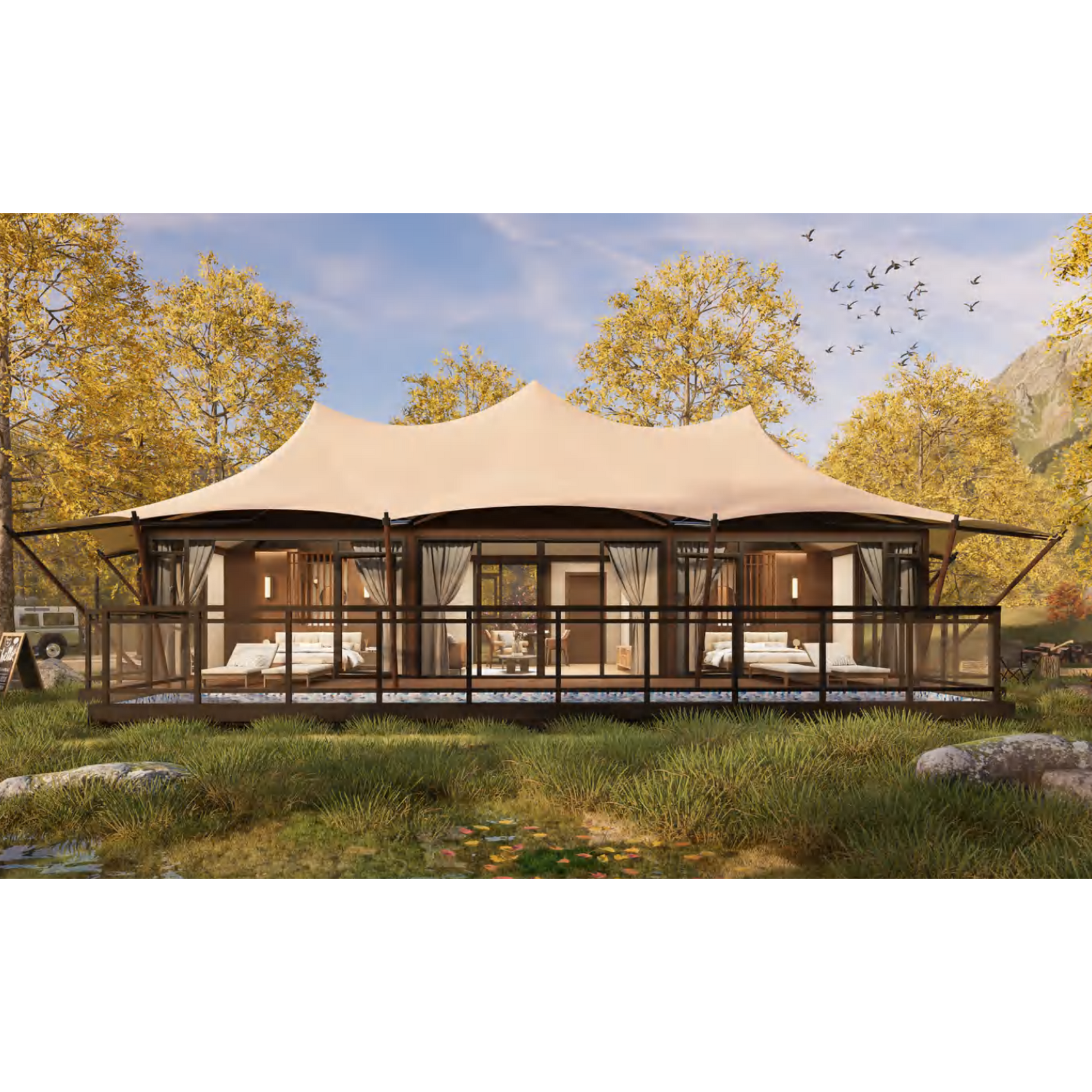 The M74 Two-Peak Lodge Tent is designed for those seeking an extraordinary outdoor experience with comfort and elegance. Perfect for eco-resorts, private retreats, or luxury camps, this tent guarantees both practicality and style.