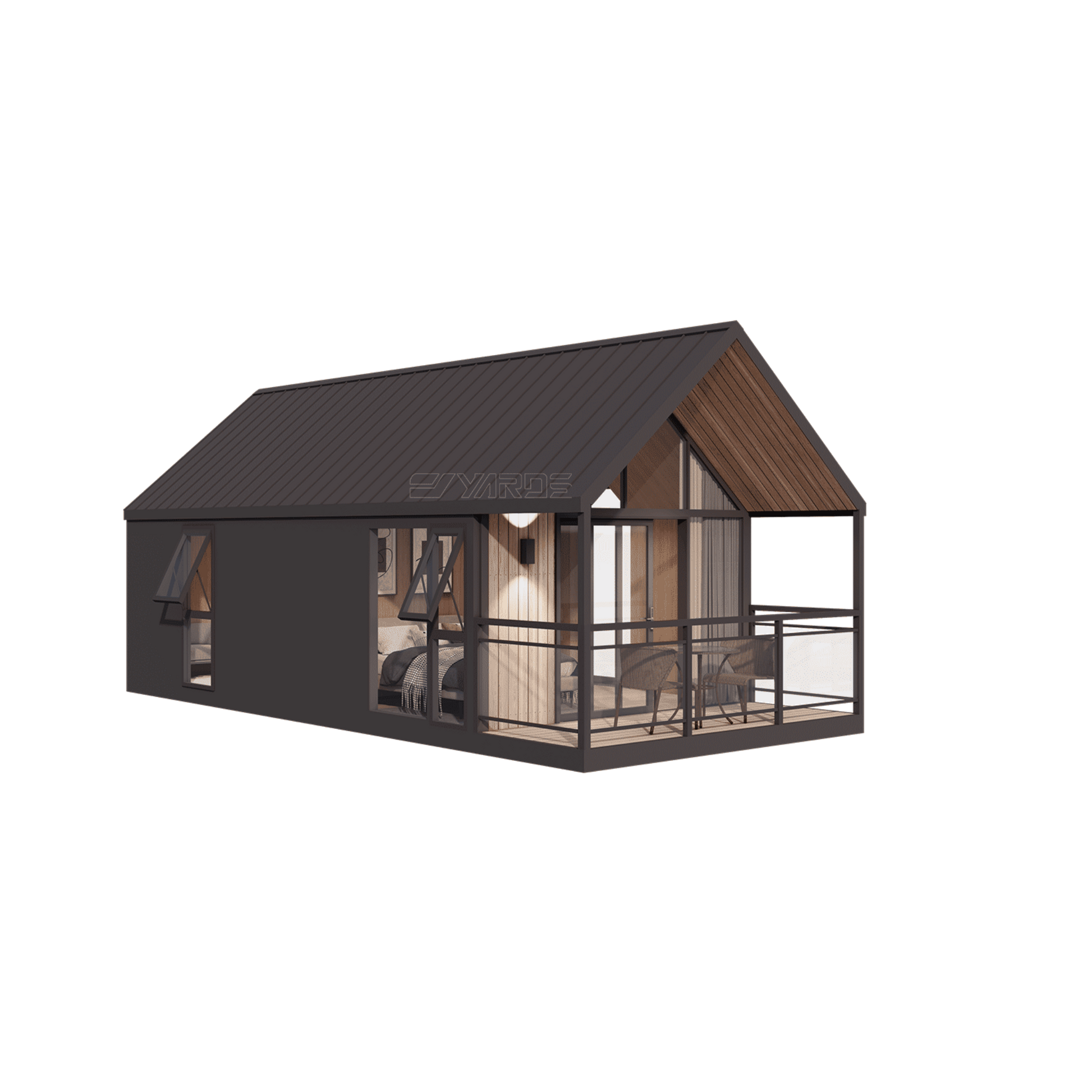 - Exterior wall material options from the manufacturer: 2 mm aluminum alloy panels with fluorocarbon coating, Cedar wood panels, WPS (wood plastic composite) boards