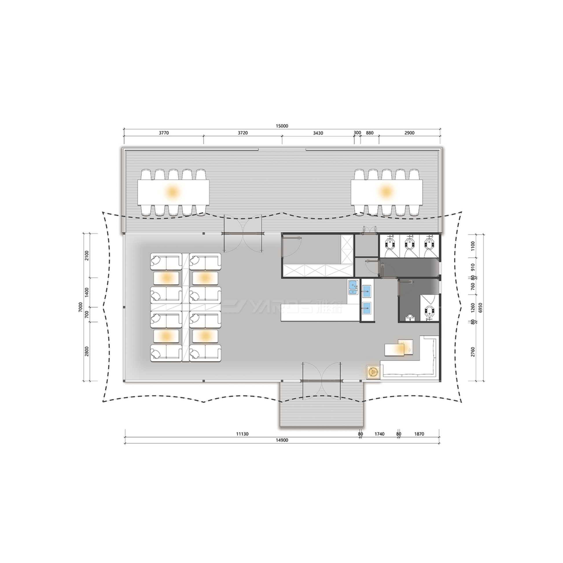 With nearly 1100 sq ft of indoor area and an expansive terrace for lounging or dining, the Y105 is perfect for luxury resort applications, offering both privacy and open-air comfort.